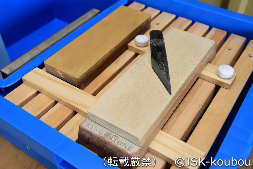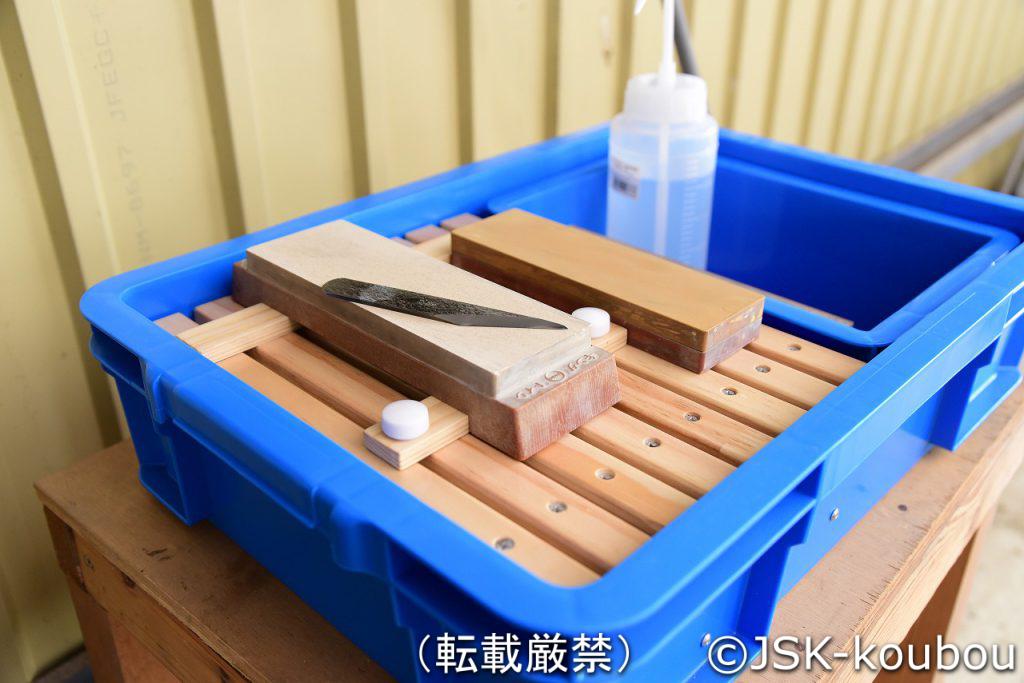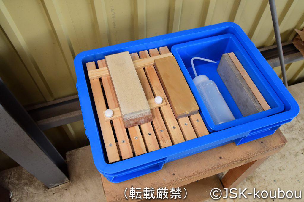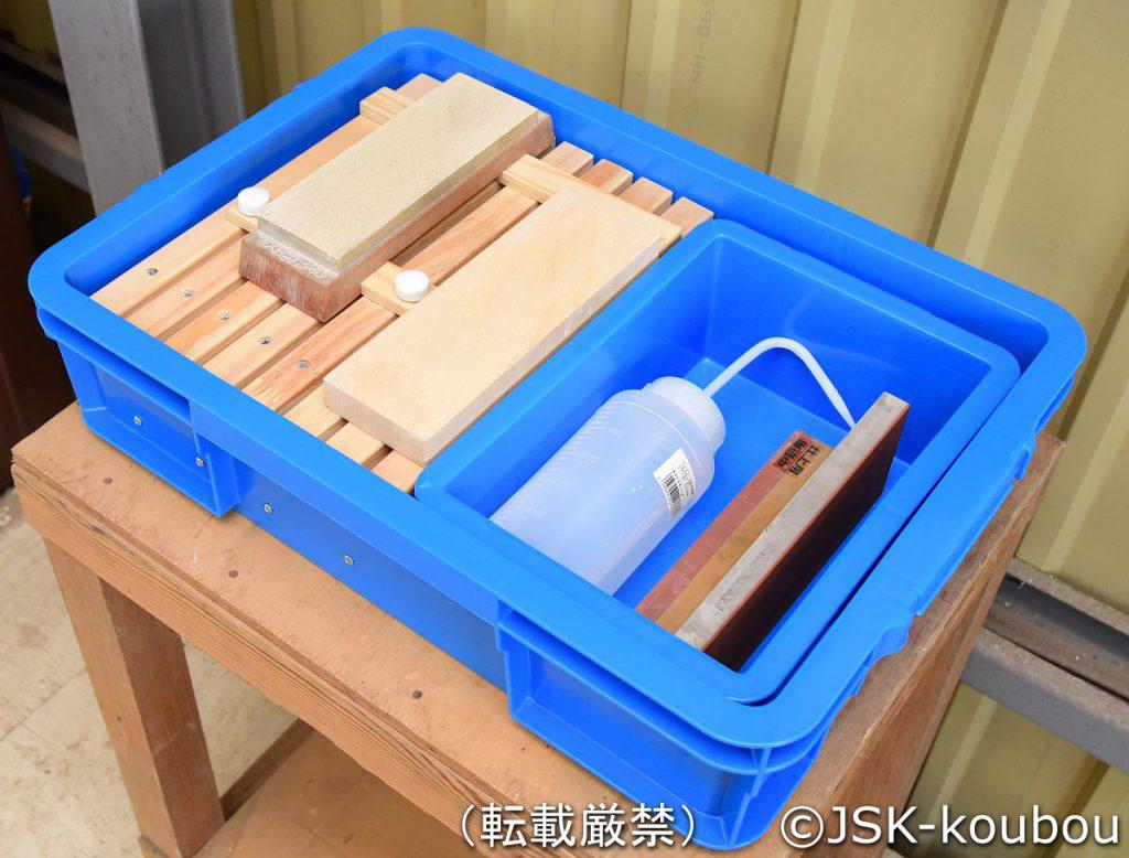 卓上研ぎ場として、刃物や砥石を洗浄する水桶と水切のよい砥石台が必要です。